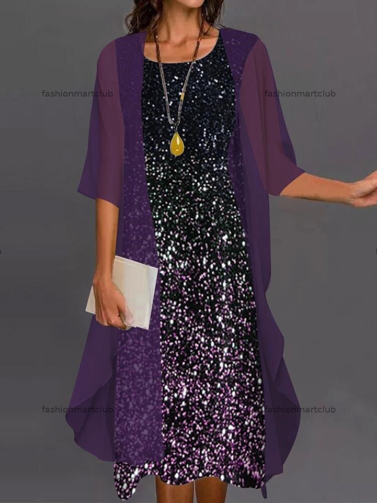 Women's 3/4 Sleeve Scoop Neck Graphic Two-piece Midi Dress