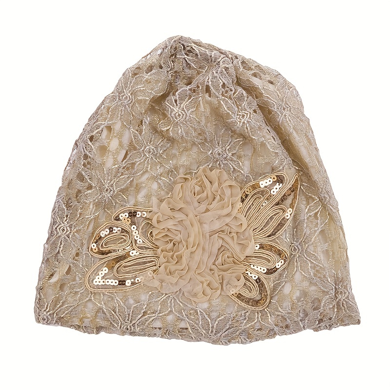 Lace Flower Sequin Slouchy Beanie Trendy Solid Color Double Layer Beanies Elegant Skull Cap Warm Chemo Hats For Women