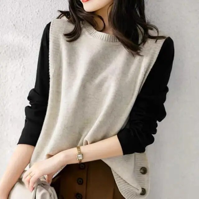 Women Elegant O-neck Sweater Vests Loose Sleeveless Knitted Sweaters Side Button All-match Stylish Popular Solid Cozy Pullovers