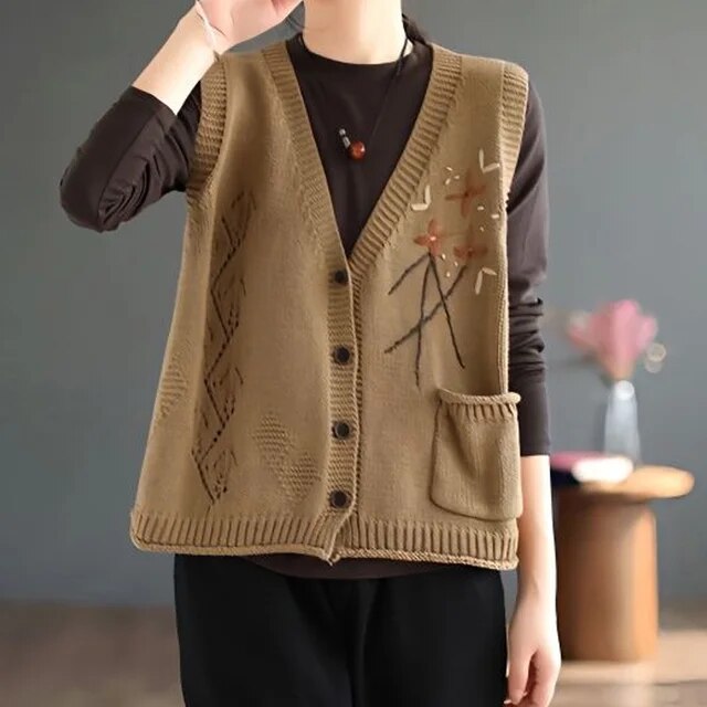 Office Lady's Casual Solid Fashion Sweater with Button Pocket Patchwork Sleeveless Vest