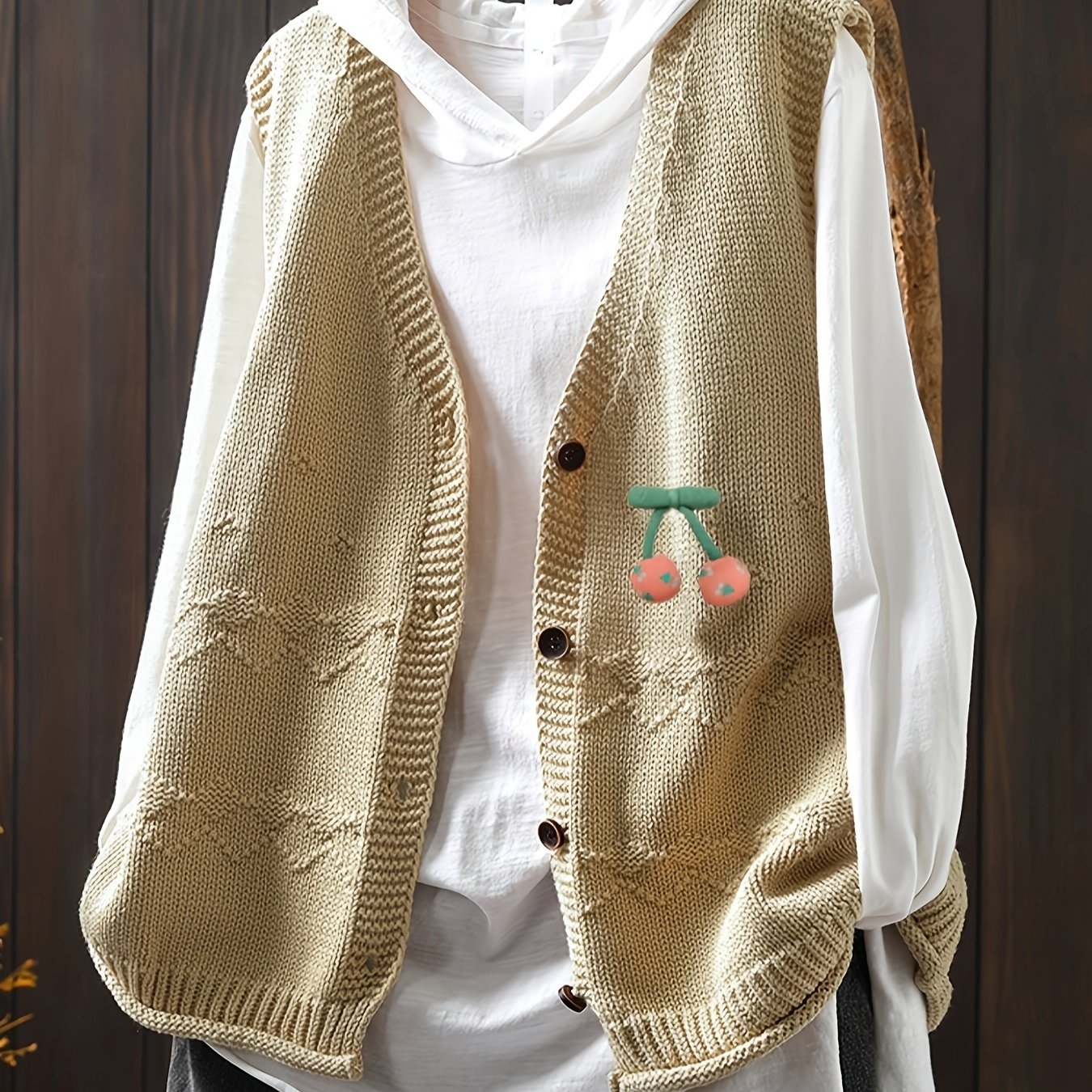 Elegant V-Neck Knit Sweater Vest for Women - Handcrafted Floral Design, Button Detail, Machine Washable - Perfect for Spring & Fall
