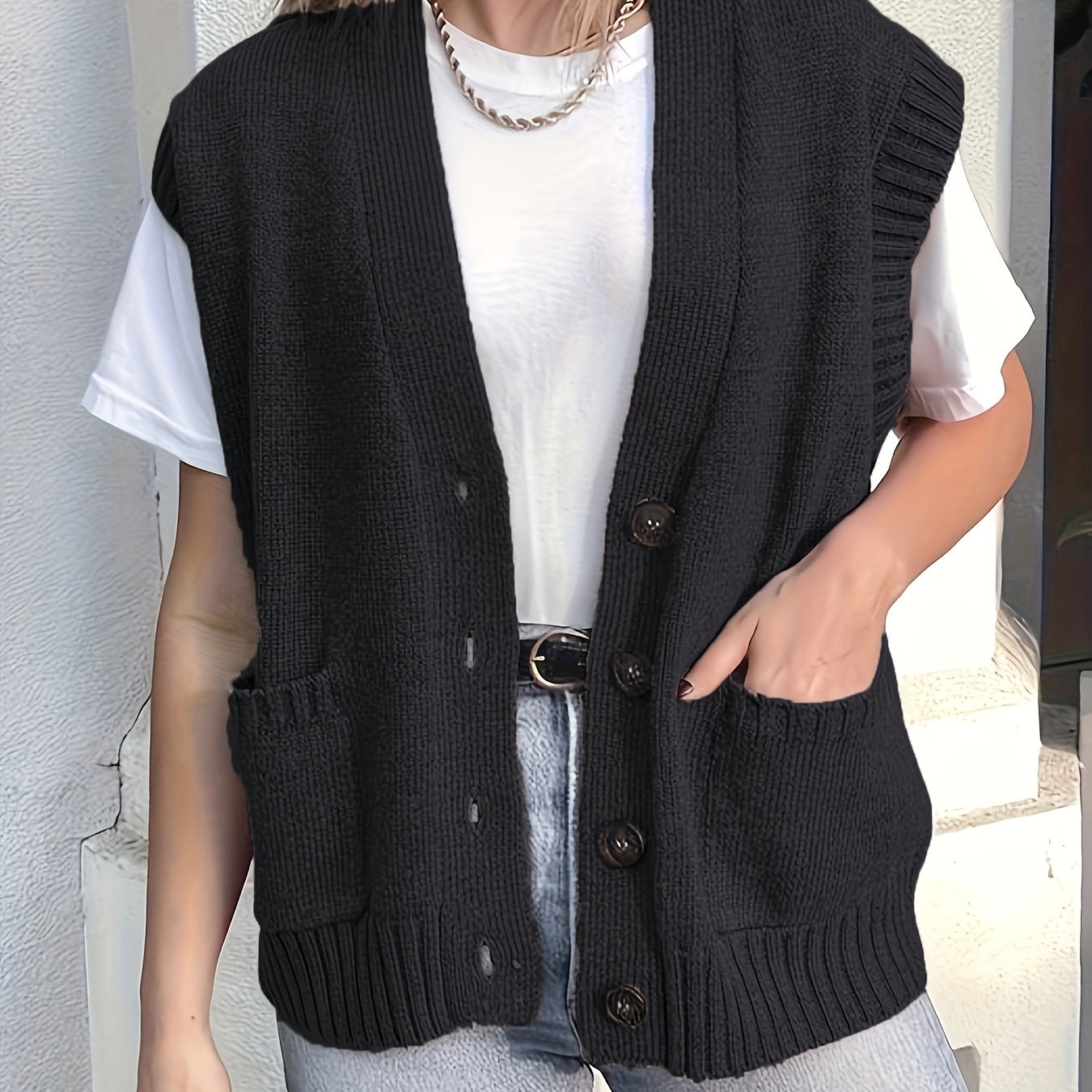 Plus Size Cozy Sleeveless Knitted Cardigan - Soft, Casual, Double Pockets, Button Front, Comfortable, Versatile, Easy to Wear, Women's Plus Size Clothing for Daily Life