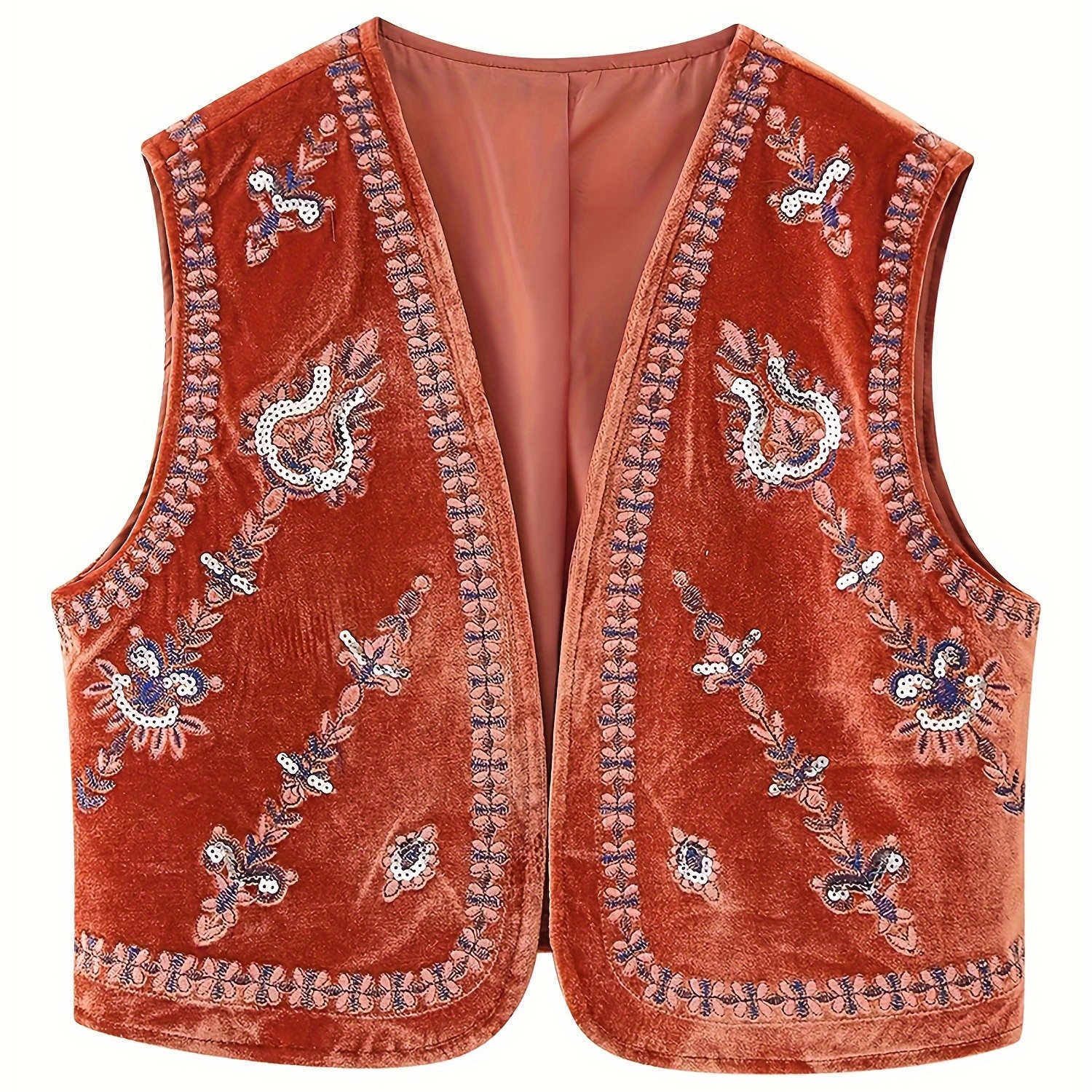 Velvet Vest for Women - Classic Sleeveless Open Front Cardigan with Embroidered Design for Fall Outwear