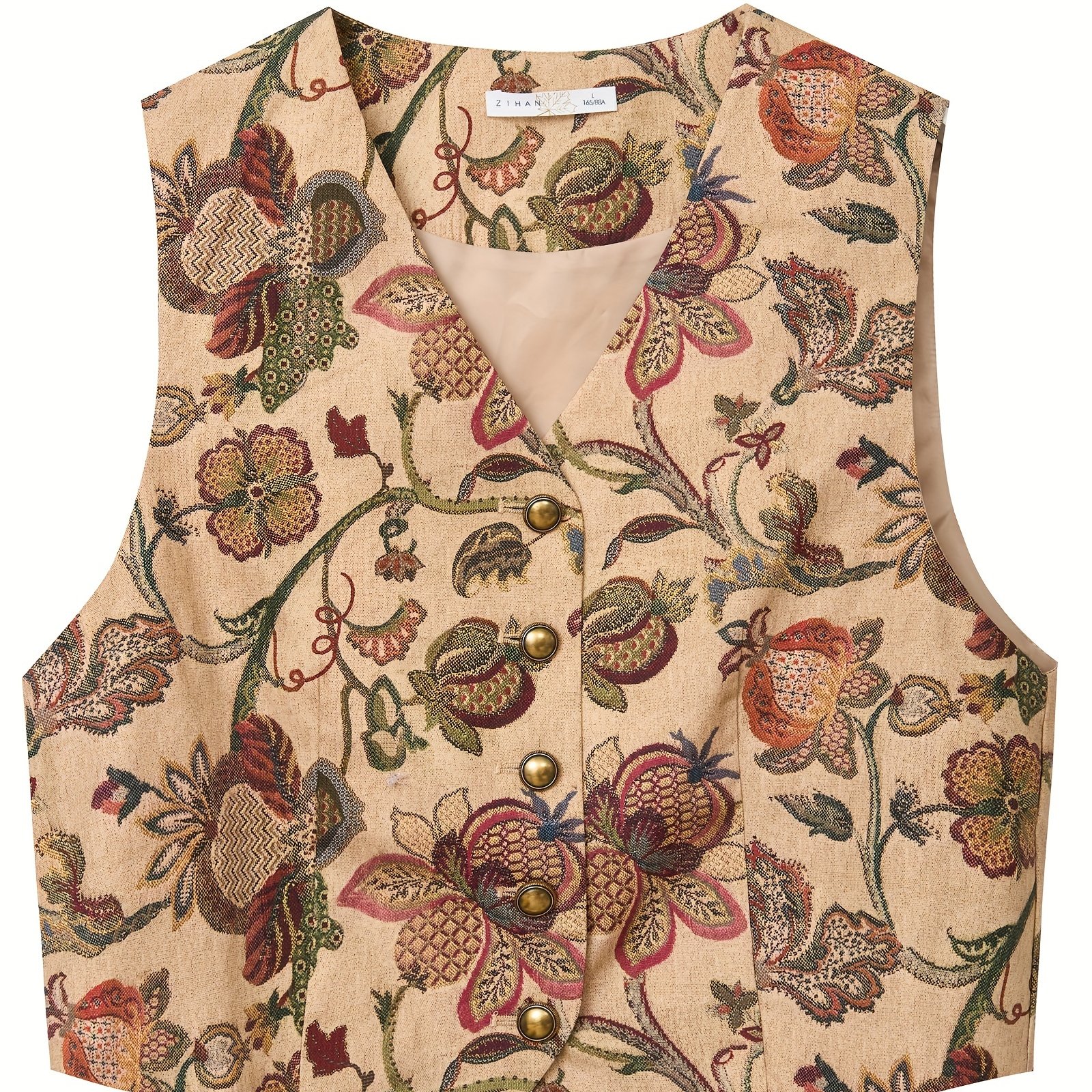 Vibrant Floral Print Vest for Women - Sleeveless V Neck Button Front Vest - Vintage Inspired, Comfortable, and Stylish Clothing for Everyday Wear