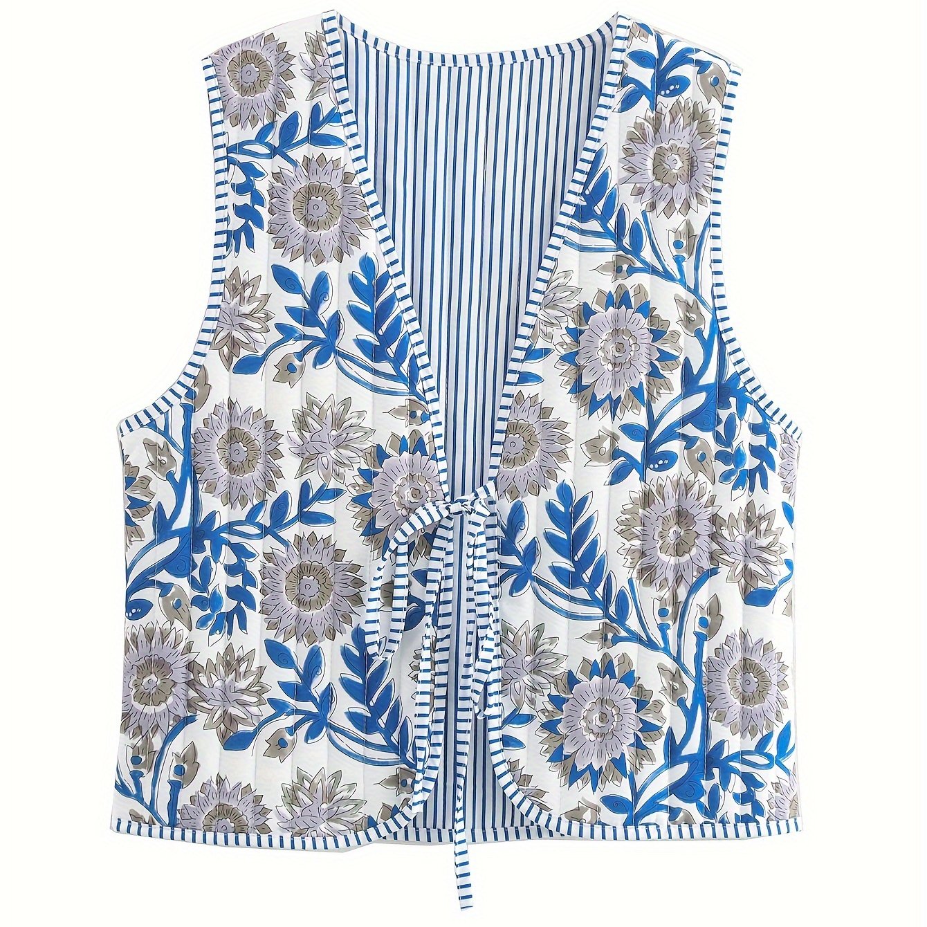 Women's Floral Printed Vest CT008995DAA, Polyester Sleeveless Cardigan, V-Neck, Casual Style, Tie Front, All-Season, Adult, Woven Fabric
