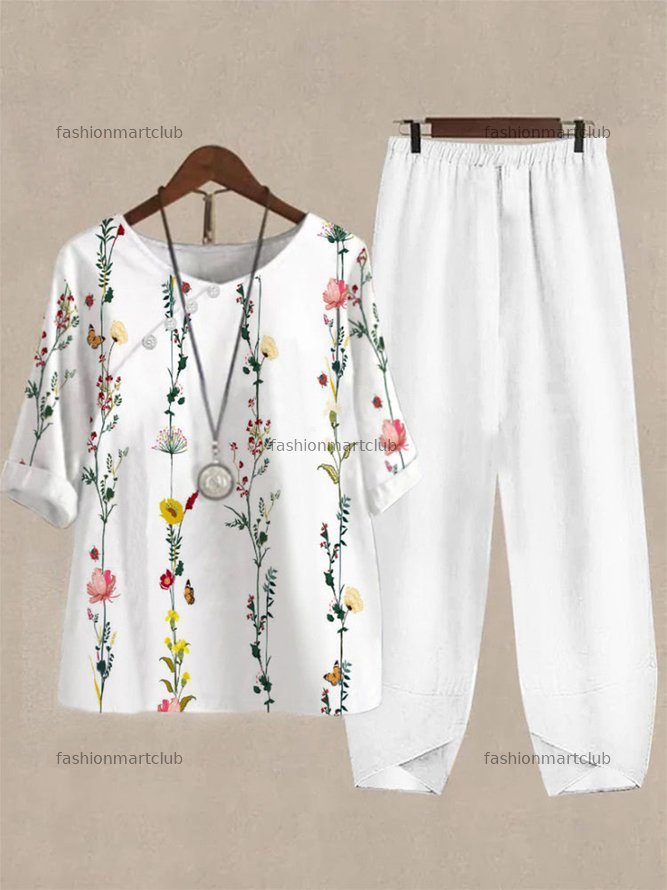 Casual Floral Crew Neck Loose Two-Piece Set
