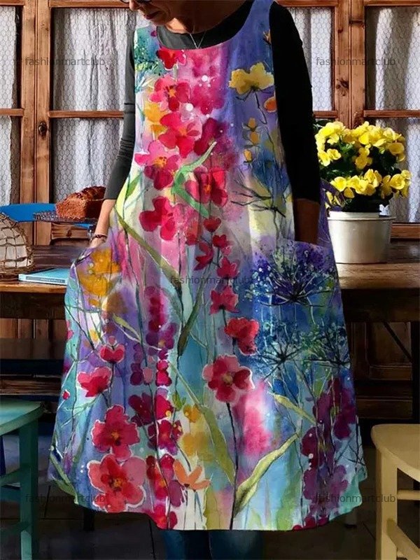 Casual Floral Oil Painting With Pocket Print Dress