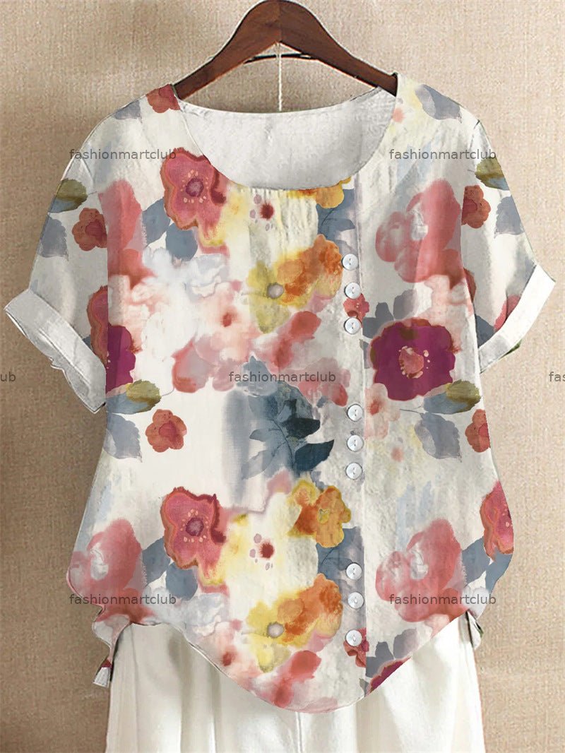 Casual Short Sleeve Printed Crew Neck Linen Top