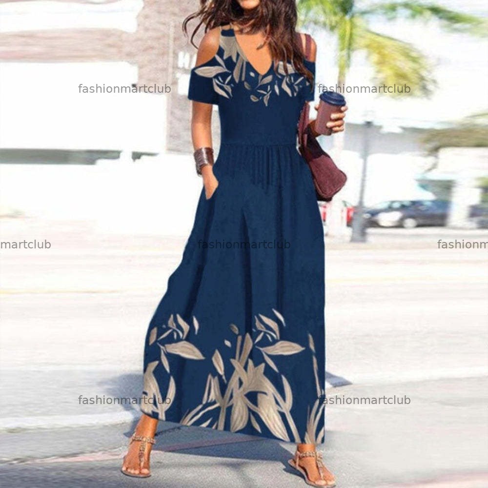 Make an entrance with this pretty maxi dress featuring a beautiful cobalt-midnight blue shade and neutral garden print, elevating it with everyday elegance, just right for any casual or semi-dressy event. The v-neckline, short sleeves, and cut-out shoulders add a sultry vibe. A cinched waist with pleats gives way to an ankle-length silhouette. Wash in gentle or delicate cycle with light colors. Keep away from dark colors.