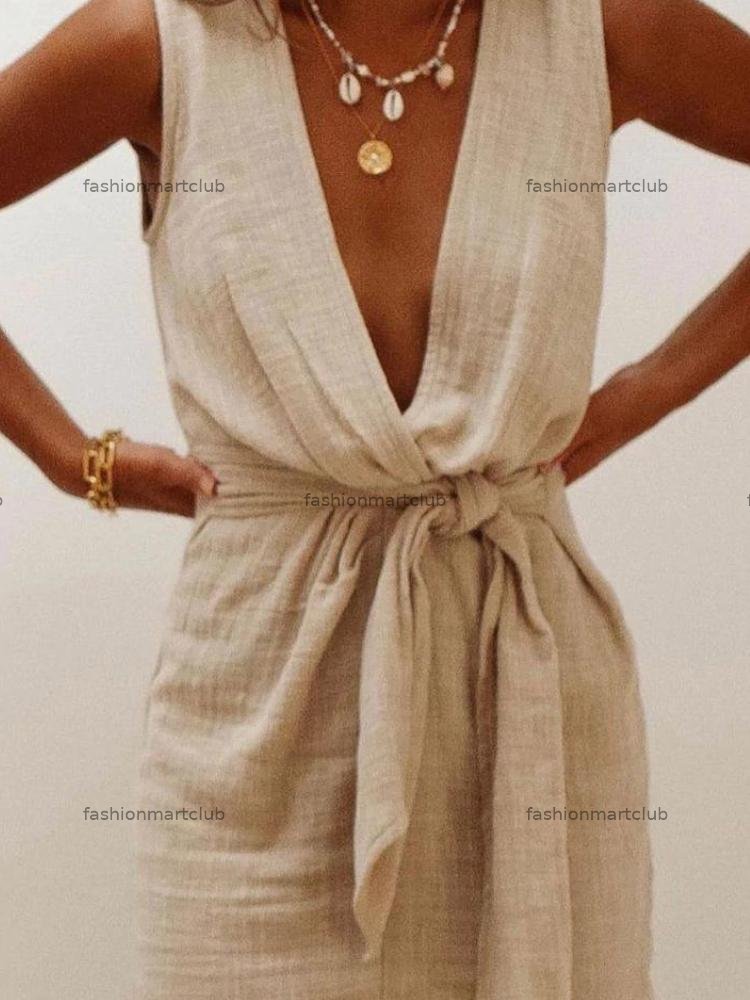 Cotton And Linen V-Neck Belted Sleeveless Dress