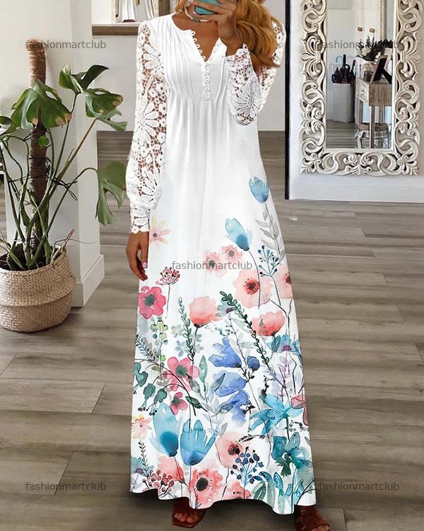 Elegant Casual Loose Half Open Collar Lace Floral Dress