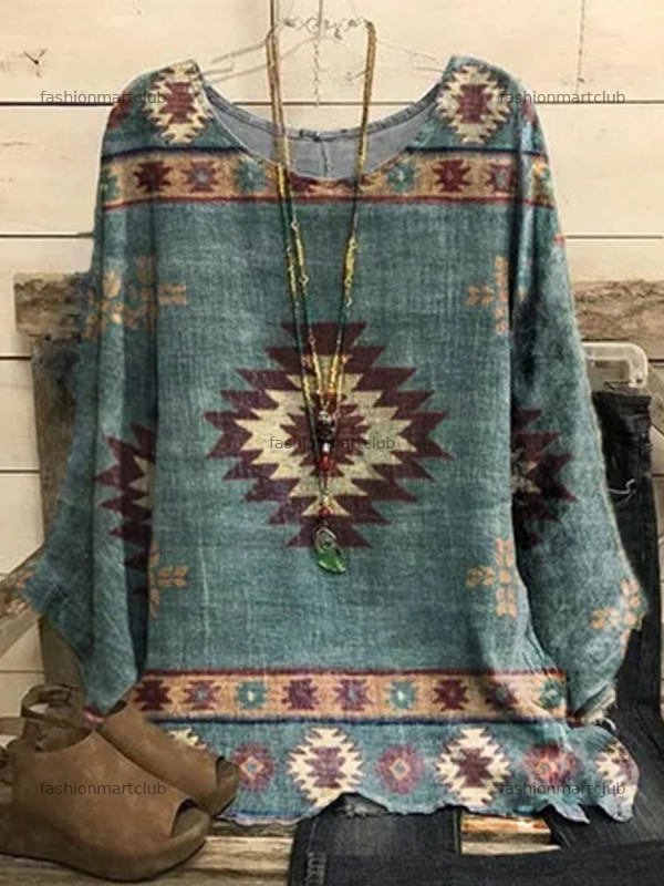 Fashion Ethnic Printed Round Neck Long Sleeve Casual Blouse