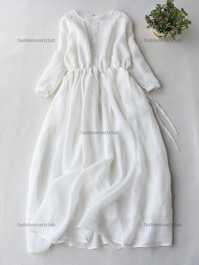 Medium Sleeved Cotton Linen Loose Lace Up Pleated Large Swing Dress
