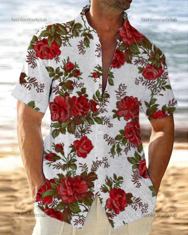 Men's Floral Stand Collar Loose Short Sleeve Shirt
