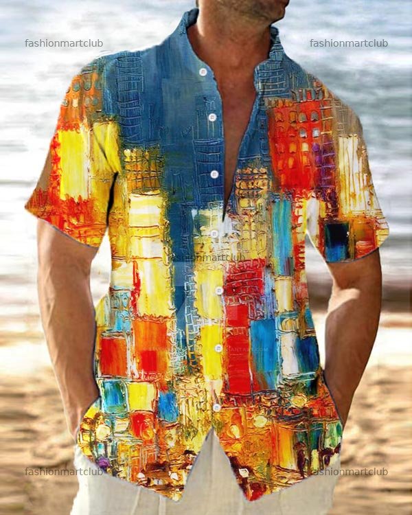 Men's Geometric Print Stand Collar Loose Short Sleeve Shirt