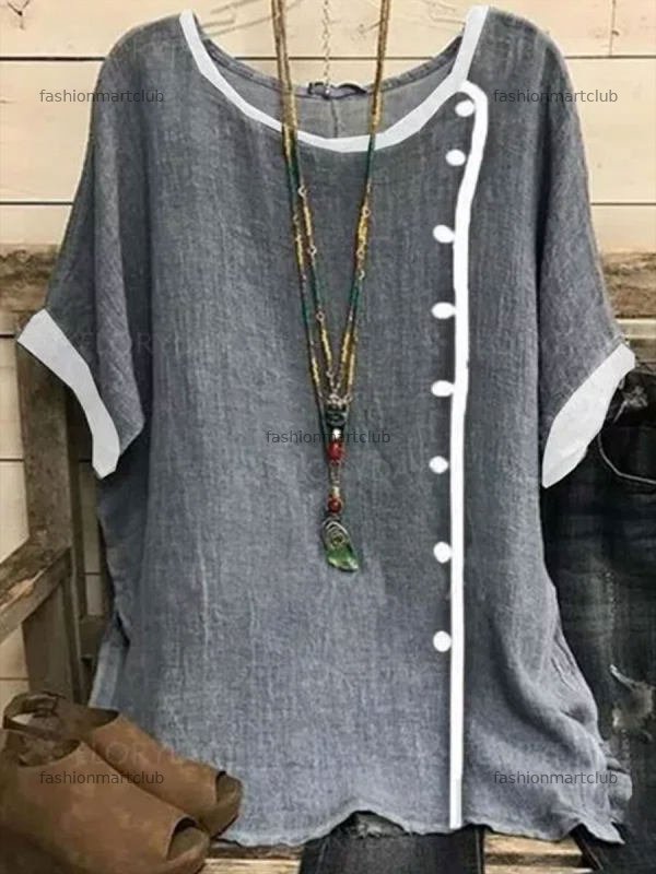 Round Neck Contrast Color Casual Loose Short-sleeved Blouse