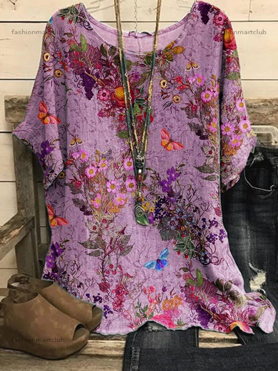 Round Neck Floral Print Casual Loose Long-sleeved Blouse