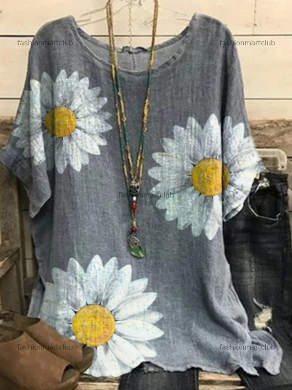 Round Neck Floral Print Casual Loose Short Sleeve Blouse