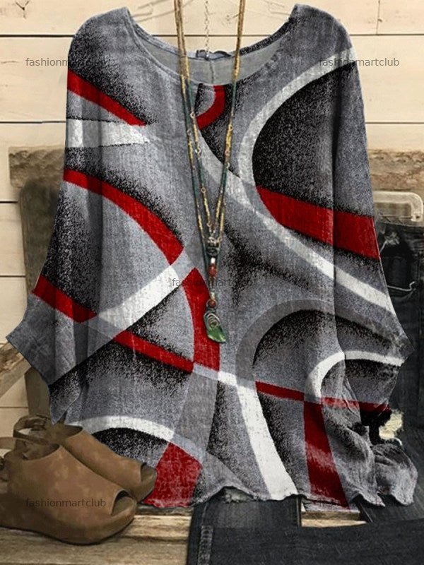 Round Neck Line Art Print Loose Casual Long-sleeved Blouse