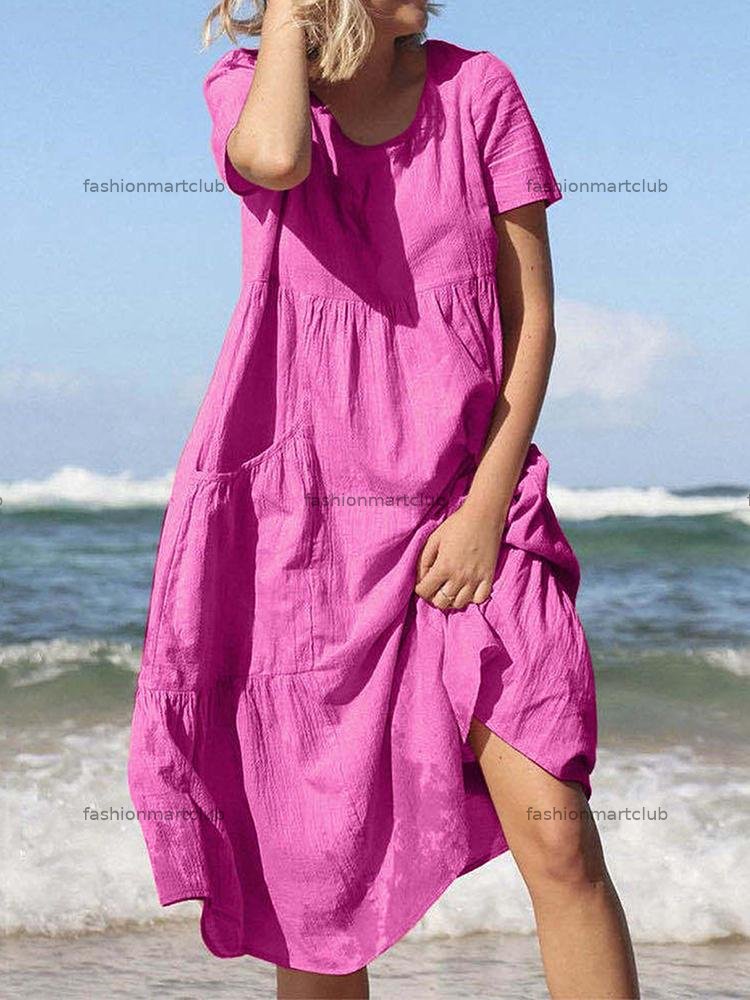 Round Neck Loose Big Hem Pocket Short Sleeve Dress