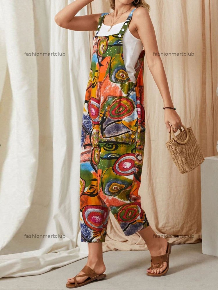 Vintage Personalized Printed Pocket Cotton Linen Women's Large Jumpsuit