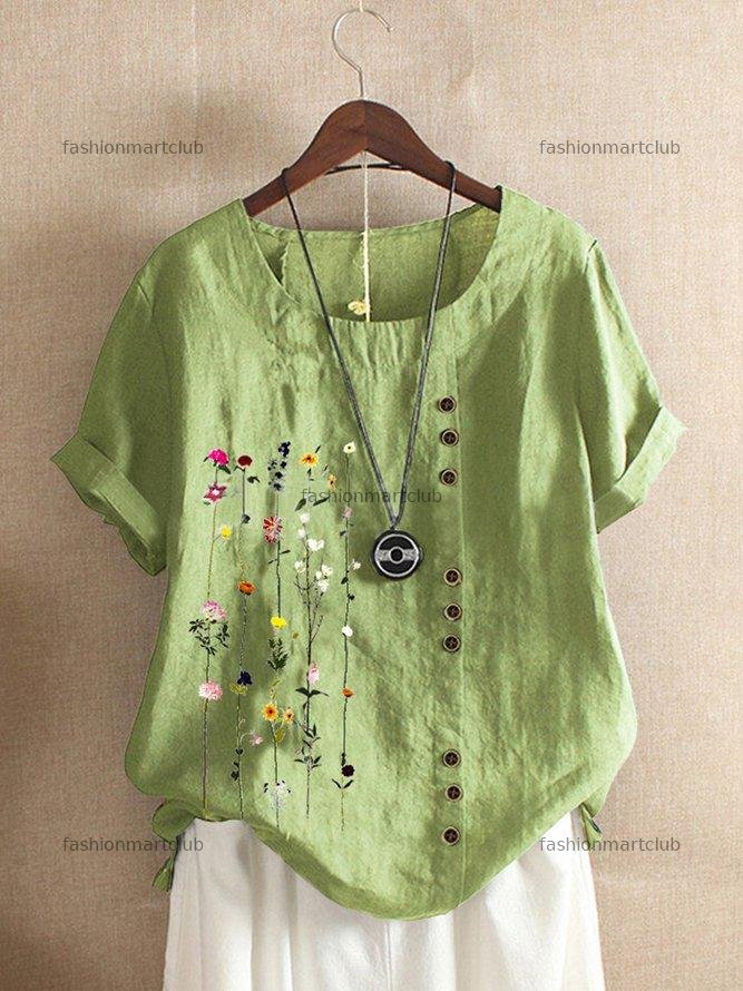 Vintage Short Sleeve Floral Printed Crew Neck Plus Size Casual Tops