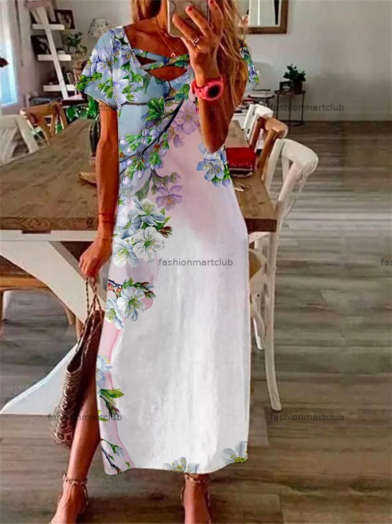 Women's V-neck Short Sleeve Floral Printed Graphic Maxi Dress