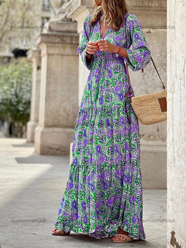 Women's Long Sleeve V-neck Graphic Maxi Dress