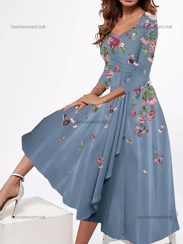 Women's 3/4 Sleeve V-neck Graphic Floral Printed Midi Dress