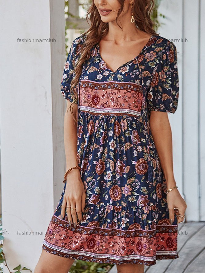 Women's Short Sleeve V-neck Graphic Floral Printed Midi Dress