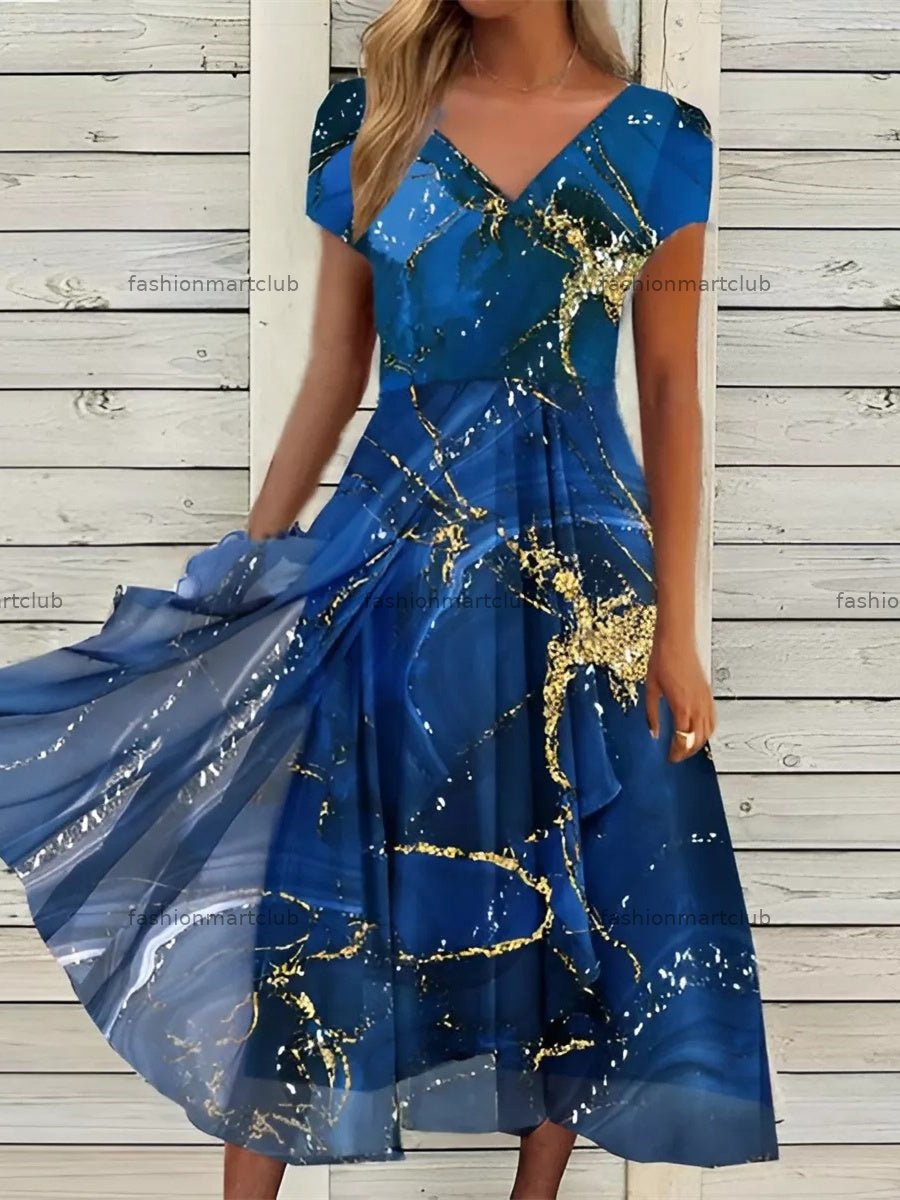 Women's V Neck Short Sleeves Graphic Printed Midi Dress