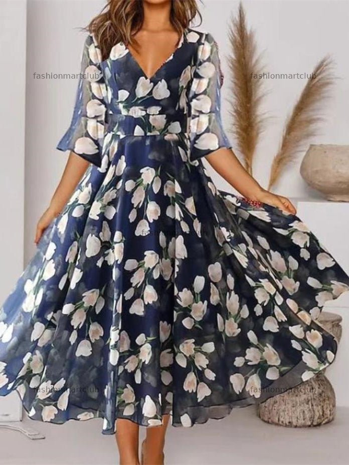 Women's V Neck Half Sleeves Floral Printed Midi Dress