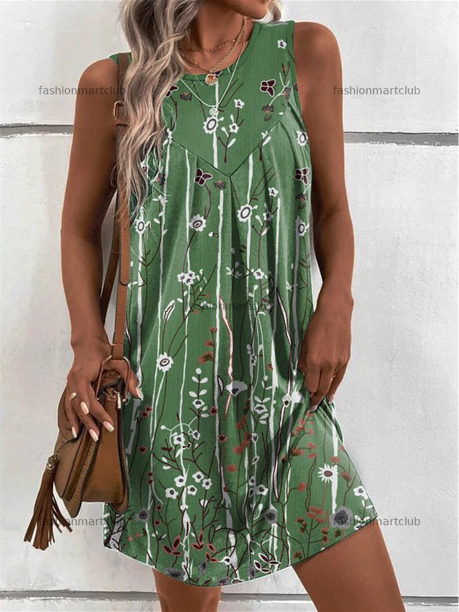 Women's Graphic Printed Loose Pleated Sleeveless Scoop Neck Midi Dress