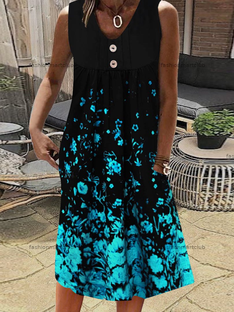 Women's Black V-Neck Sleeveless Floral Printed Midi Dress