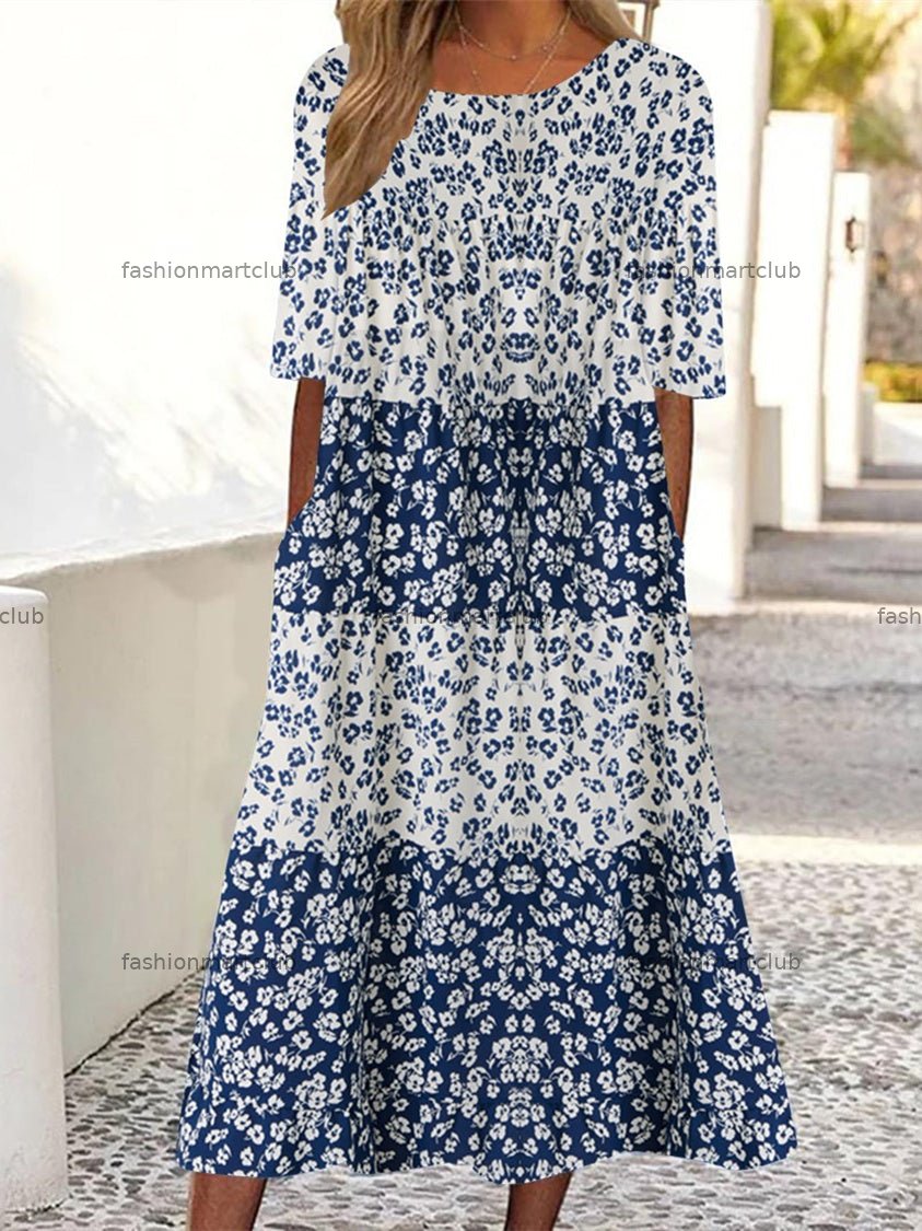 Women's Half Sleeve Scoop Neck Graphic Floral Printed Midi Dress