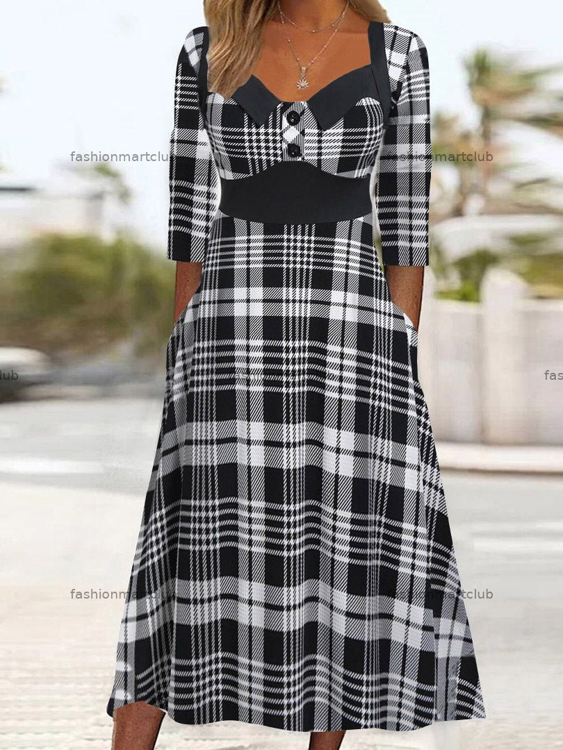 Women's Plain Plaid V-neck Lapel Casual Midi Dress