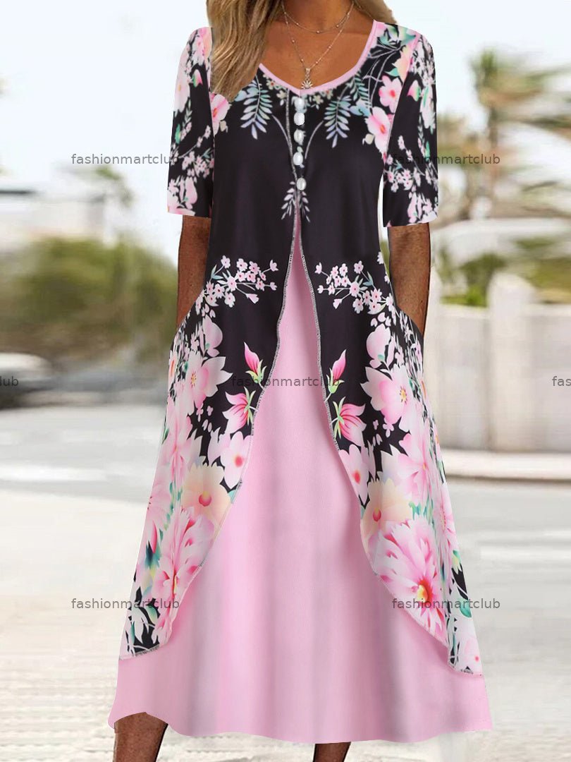 Women's Half Sleeve V-neck Graphic Floral Printed Midi Dress
