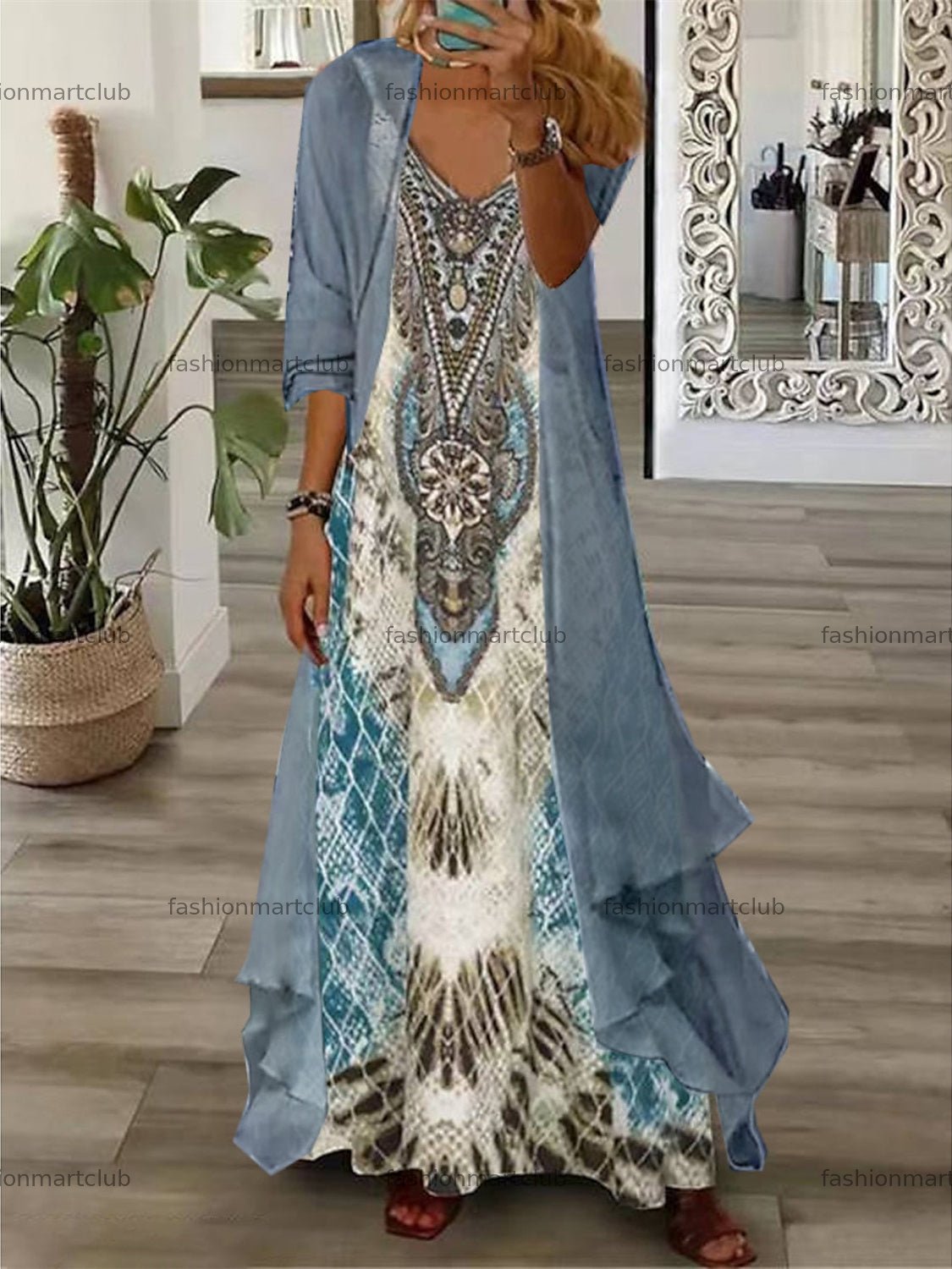 Women's Half Sleeve V-neck Graphic Printed Two Pieces Maxi Dress
