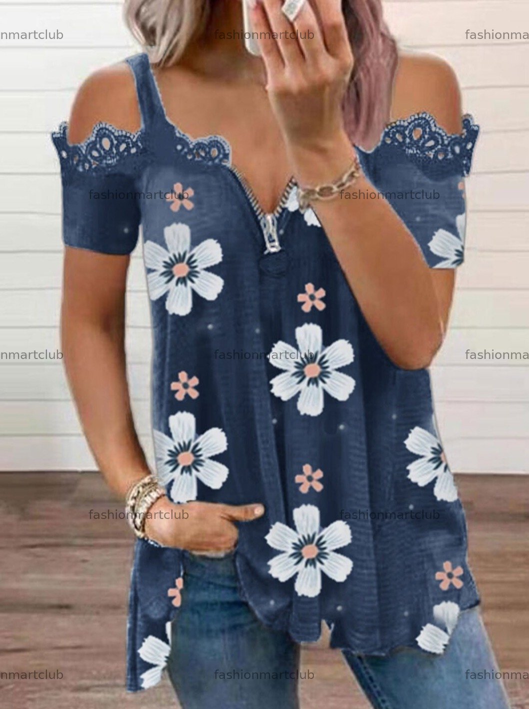 Women's Blouses Floral Print Zip Off Shoulder Blouse