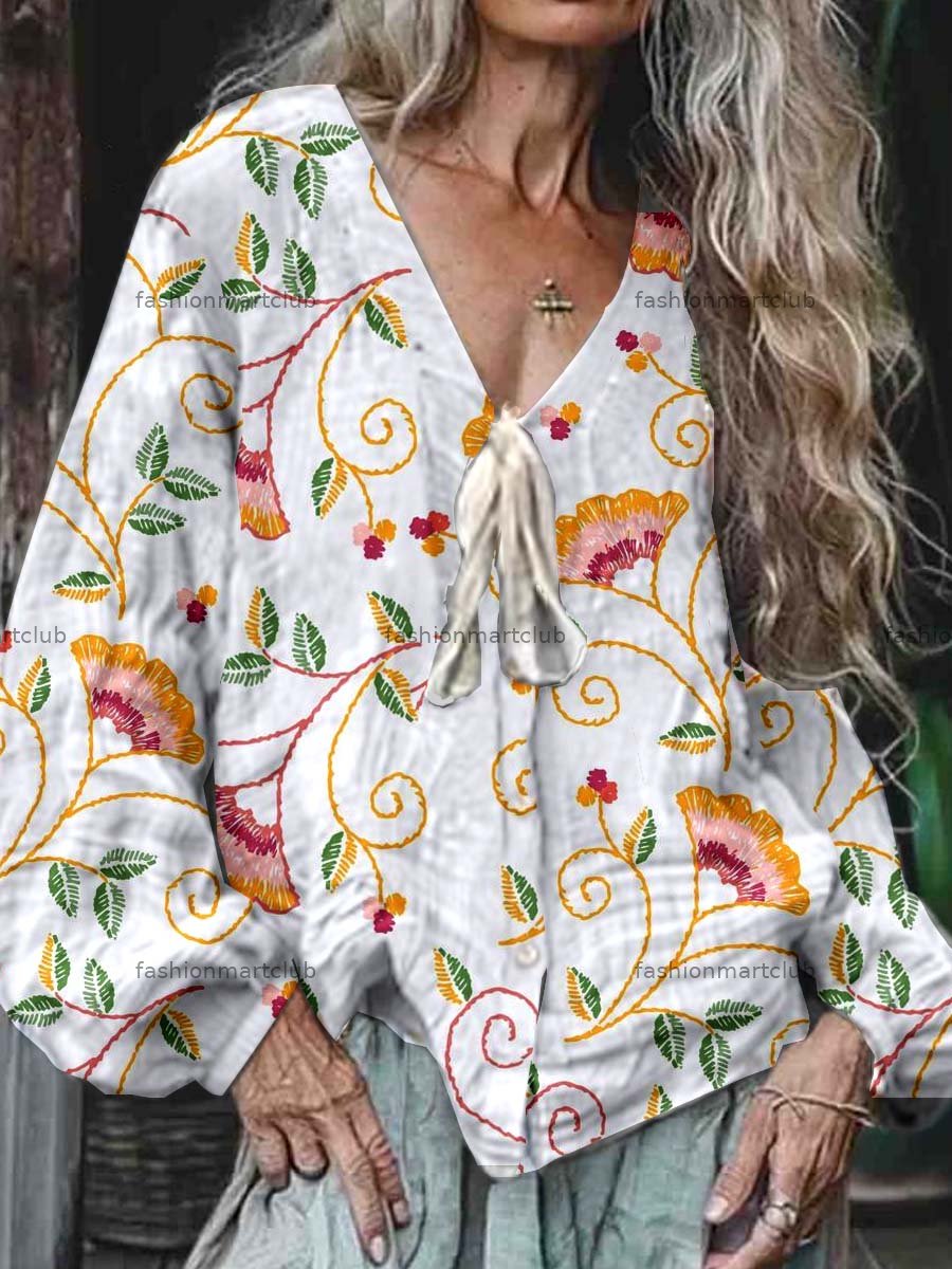 Women'S Artistic Flowers Cotton And Linen Shirt