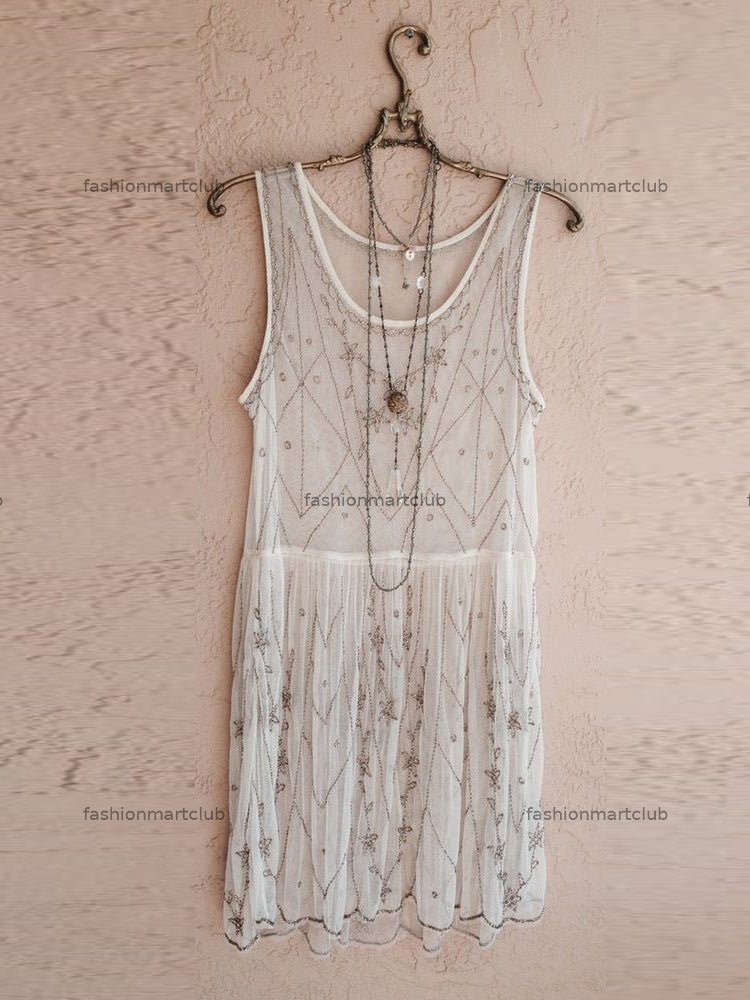 Womens Printed Sleeveless Drop Waist Linen Dress