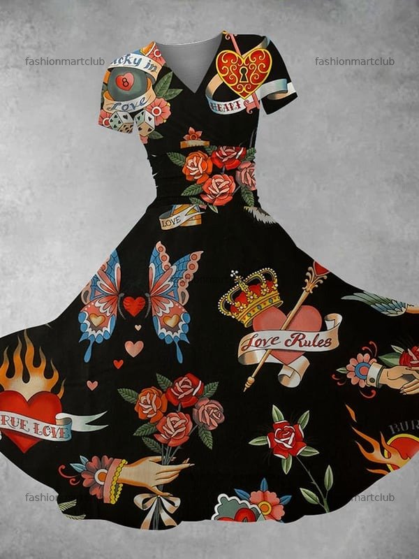 Retro Rose Tattoo Print Maxi Dress