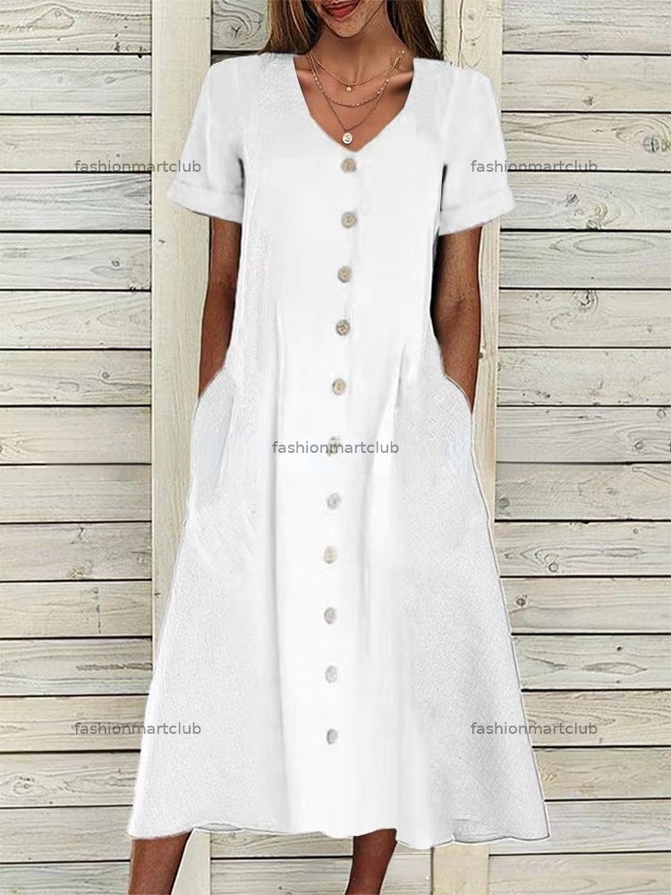 Women's Solid Loose V-Neck Cotton Linen Dress