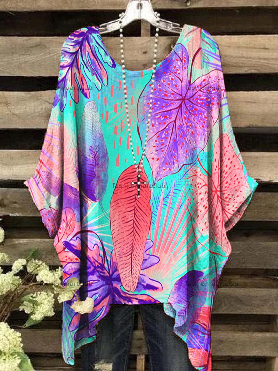 Women's Vintage Abstract Leaf Pattern Round Neck Top