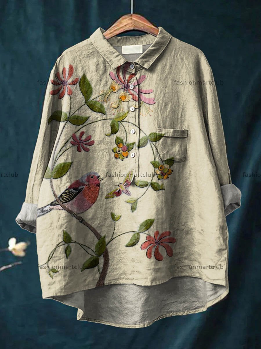 Women's Vintage Ethnic Floral Bird Art Print Casual Cotton And Linen Shirt